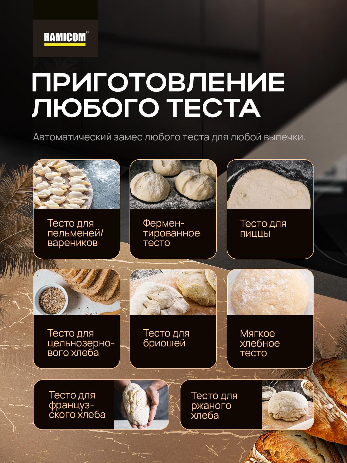 В комплект входит хлебопечка 29-в-1 Ramicom Premium Style RB8200RA9100 и вторая, дополнительная форма для выпечки хлеба Ramicom RA9100. Хлебопечка Ramicom Premium Style RB8200RA9100 — это идеальное решение для тех, кто любит свежий и домашний хлеб. Благодаря мощному мотору и большой чаше, вы можете приготовить до 1 кг ароматного хлеба. В разнообразных режимах приготовления хлебопечь позволяет выбрать одну из трёх степеней подрумянивания корочки, настроить прочие параметры на свой вкус, а таймер — начать приготовление в нужное время. Заранее подготовлены 29 программ: 21 программа выпечки, 8 программ для подготовки теста. Благодаря большой мощности этой хлебопечки вы сможете приготовить хлеб от 750 граммов до 1 килограмма. Одним из главных преимуществ хлебопечки является ее компактность и удобство использования. Она легко помещается на кухне и не занимает много места. Кроме того, устройство имеет стильный дизайн, который отлично впишется в любой интерьер. Домашняя хлебопечь Ramicom Premium Style RB8200RA9100 также обладает высокой производительностью и скоростью приготовления хлеба. Она может выпекать хлеб быстро и качественно, что позволяет экономить время и силы. Кроме того, она оснащена функцией автоматического поддержания температуры, что гарантирует свежесть и качество хлеба. Хлебопечь Ramicom Premium Style RB8200RA9100 также легко чистится и имеет компактный размер, что позволяет легко хранить ее на кухне. Хлебопечка Ramicom – это отличное вложение для тех, кто ценит домашний уют и вкусную еду. Ramicom Premium Style RB8200RA9100 – это не только хлебопечка. В хлебопечке Ramicom Premium Style RB8200RA9100 можно не только приготовить хлеб или джем. В режиме программы номер 16 можно потушить мясо, рыбу, овощи. Например, вы можете без лишних хлопот приготовить курицу с картофелем или рыбу с овощами.